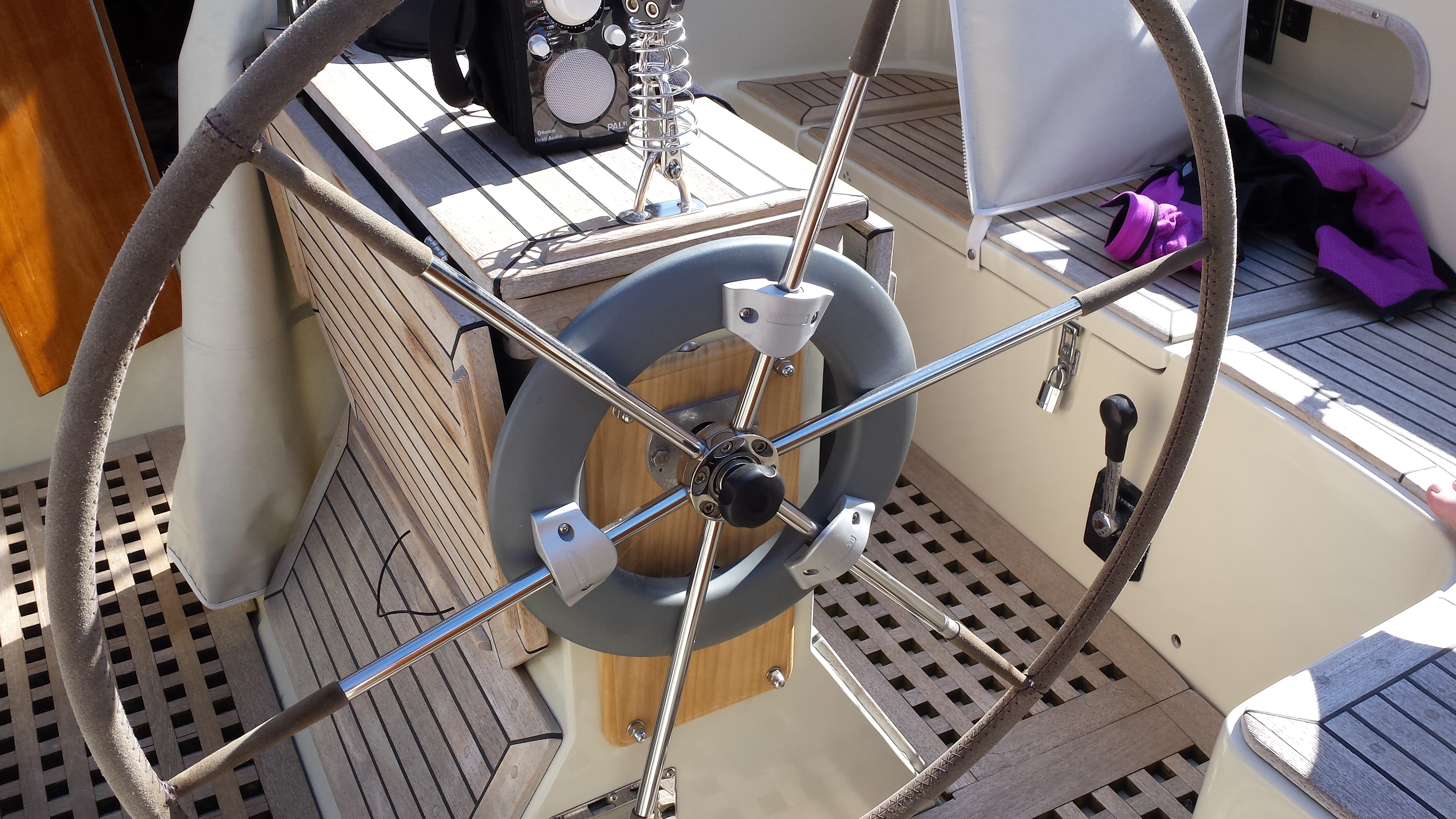 Förberedelserna för sommarens långsegling har varit många och långa under de senaste månaderna. Flera helgseglingar har fått ge vika för bryggsegling med tillhörande uppgraderingar, motorunderhåll och kabeldragning. Bland alla småfixar återfinns den nya rattplattan. När jag bytte styrning för en väldans massa år sedan sågade jag som hastigast till en plywood-skiva med kantlister för att få lite stadga i rattinfästningen. Plasten där ratten sitter fast i bordet är rätt så illa åtgången och har spruckit på flera ställen. Inte så att det är någon fara med hållfastheten men tillräckligt för att ratten inte kändes helt stabil i alla lägen. Med en träplatta som täcker större delen av bordsgaveln blir stabiliteten dock total och känslan i ratten och styrningen känns väldigt trygg. Den gamla träplattan var aldrig tänkt som en permanent lösning och nu sitter där istället en massiv teakskiva som dessutom är lite finare fräst i kanterna. Fårladuga.